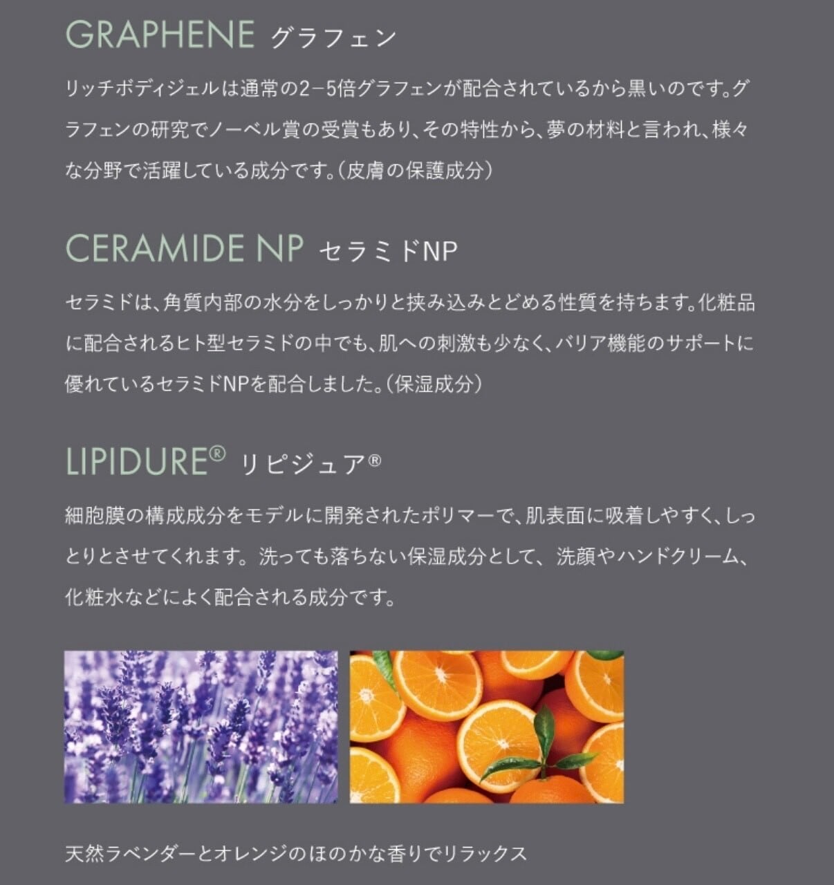 水、BG、グリセリン、グラフェン、ポリクオタニウム-51、セラミドNP、炭化(銀/チタン)、スフィンゴ糖脂質、水添レシチン、ステアリン酸スクロース、ステアリン酸、パルミチン酸、コレステロール、(アクリロイルジメチルタウリンアンモニウム/メタクリル酸べへネス-25)クロスポリマー、ラベンダー油、オレンジ油