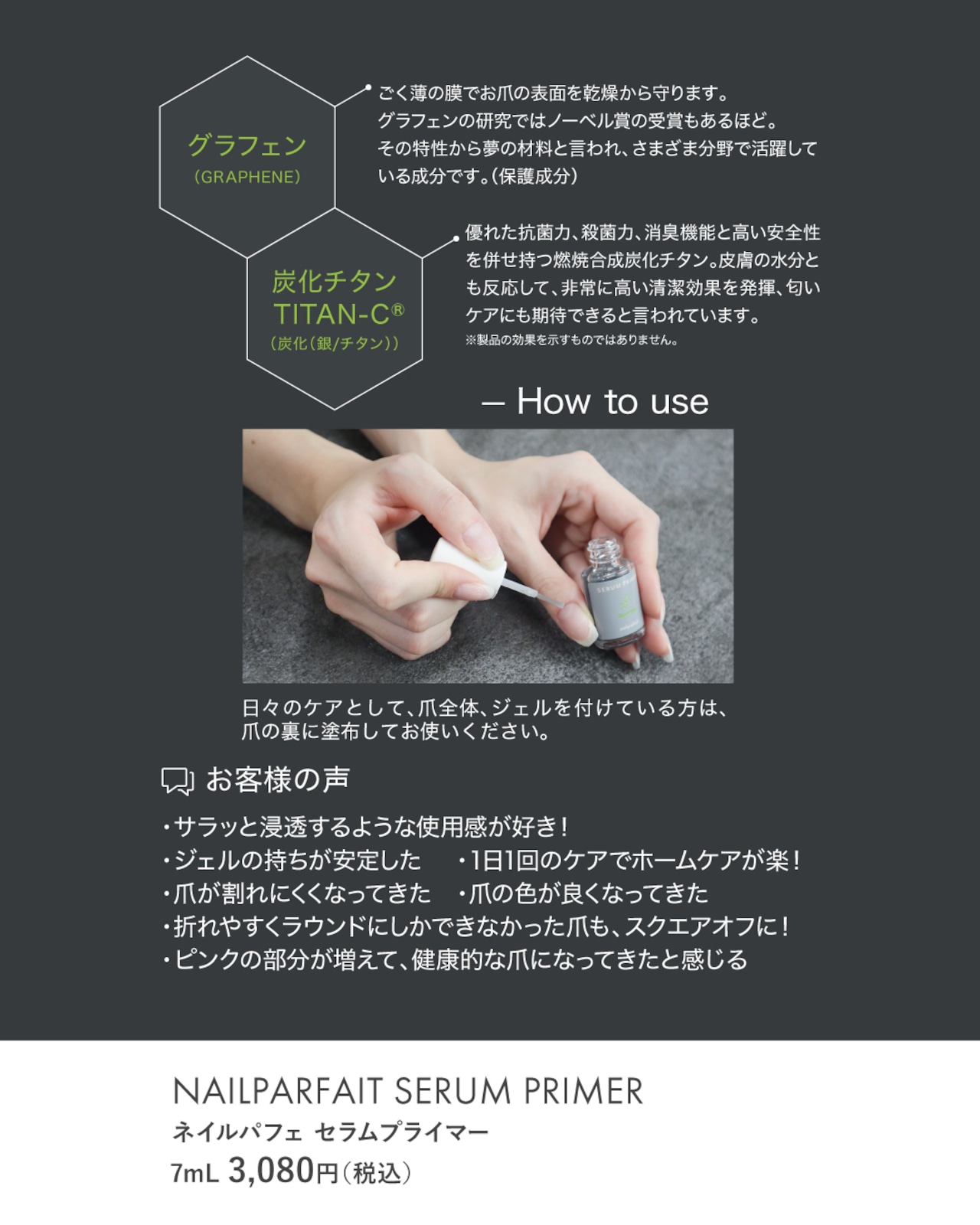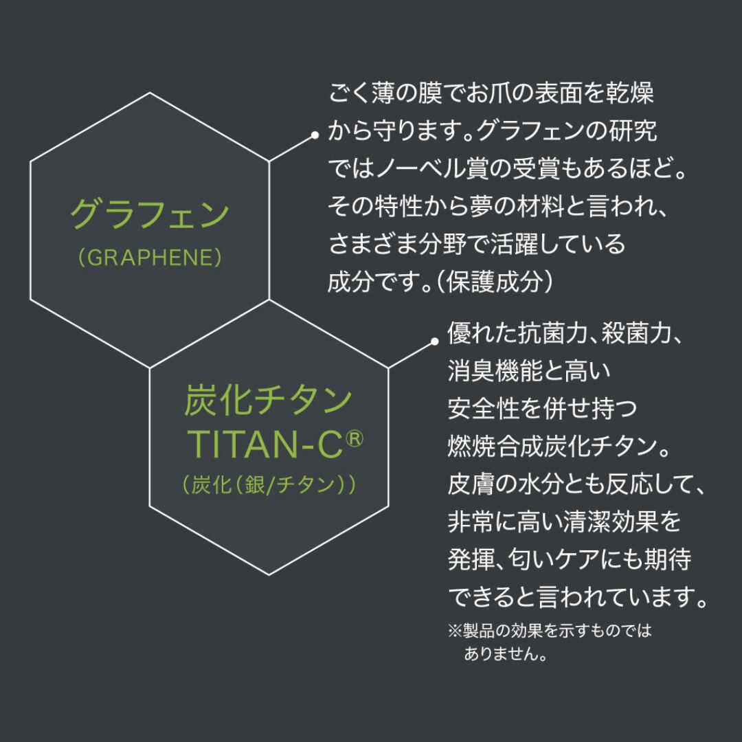 ノーベル賞も受賞したことのあるグラフェン*で爪の表面を保護しながら、炭化チタン*²が爪を健やかに保ち、「今」と「未来」の爪を守るケアが同時にできる2in1プライマーです。